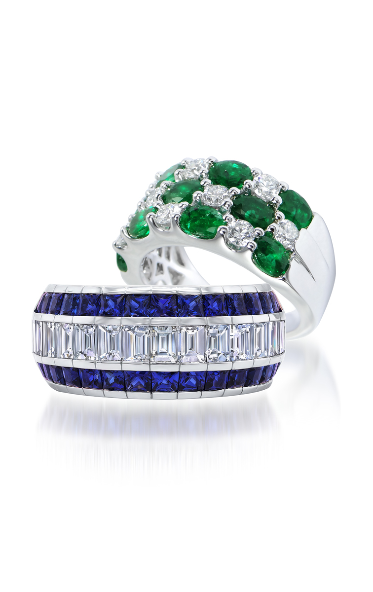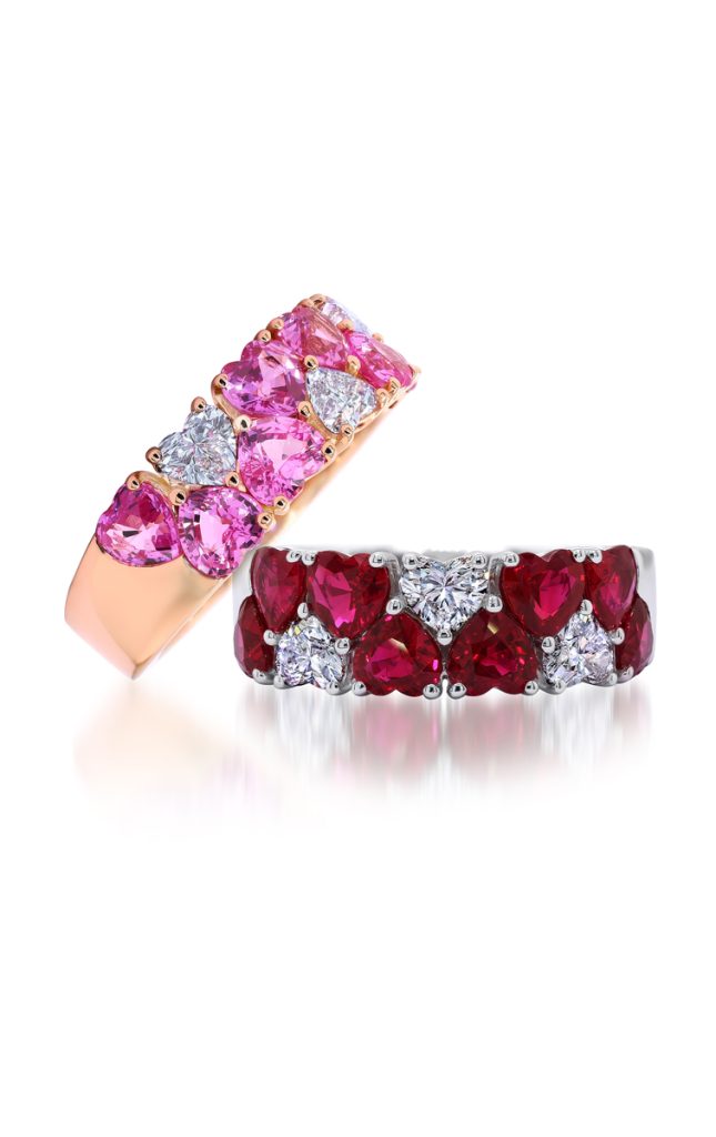 The first design pairs vivid emeralds with brilliant white diamonds, creating a lush checkerboard of green and light that feels both regal and contemporary. Its domed silhouette and intricate stone arrangement highlight exceptional setting work, allowing each gem to sit prominently while maintaining a fluid, seamless surface. Below it, a striking sapphire and diamond band features precision-cut baguette and princess stones, aligned in perfect symmetry for a sleek, architectural look. The deep royal blue of the sapphires frames the icy clarity of the diamonds, resulting in a piece that feels refined, structured and undeniably luxurious. The second duo offers a playful yet opulent interpretation of color romance. Heart-shaped rubies and matching white diamonds create a passionate, high-contrast pattern, while the pink sapphire and diamond version softens the mood with feminine warmth and rose gold tones. Together, the rings illustrate how classic gemstones can be transformed into modern statements through thoughtful design and exceptional execution; Timeluxe.com.