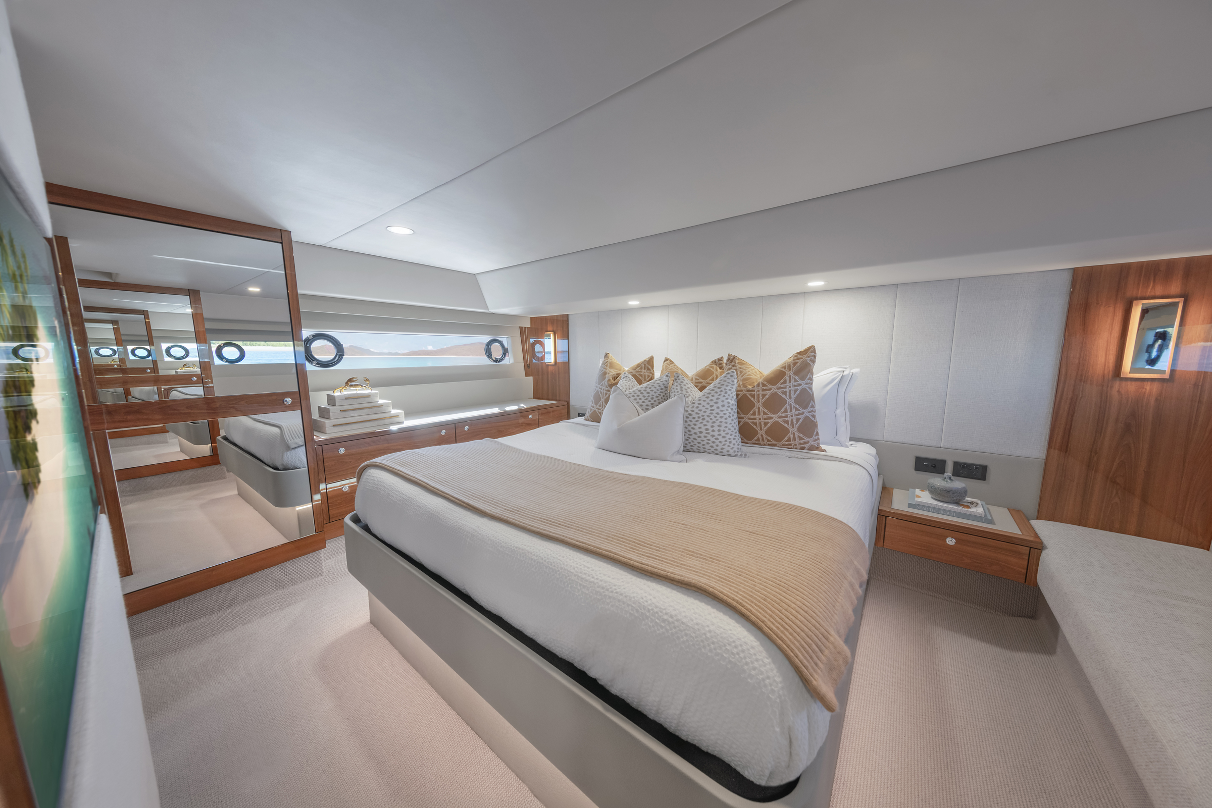 Maritimo has set the benchmark in long-range cruising motor yachts, famously pioneering the enclosed flybridge, a design now widely emulated across the industry. At the heart is founder Bill Barry-Cotter, a legendary boatbuilder whose career spans nearly 70 years of designing, building, and racing offshore boats. Stepping aboard, guests are greeted with an abundance of volume and luxury. The innovative rear swim platform raises and folds to reduce the vessel’s length when docked, and then when deployed, it transforms into a spacious entertainment area ideal for all water-based activities, no matter where you cruise; Maritimo.com.au.